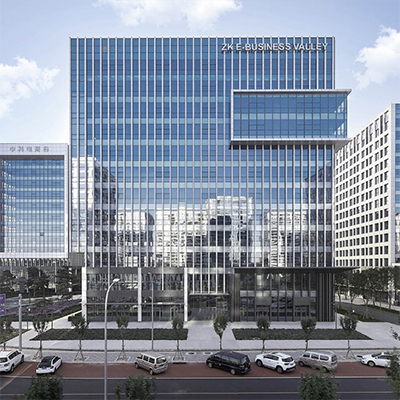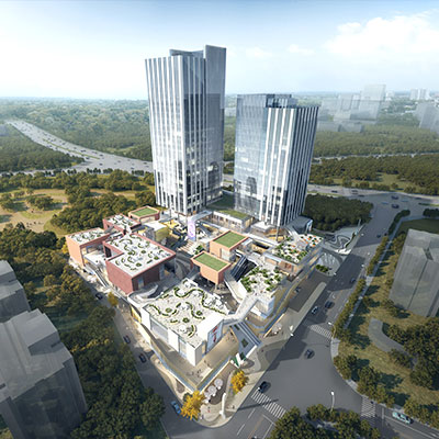 項目主要包括四棟辦公樓、裙房及中間圍合而成的廣場。高低錯落的兩棟塔樓臨近西側城市主干道,另外兩棟低層辦公樓位于項目東側。