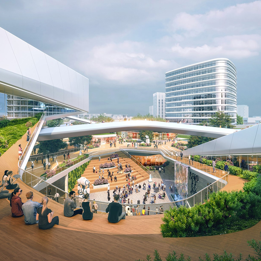 項目位于正公路與黃龍大道東南角,包括星級酒店、商務辦公及街區(qū)商業(yè)等。項目用地呈北高南低勢,多首層的建筑空間將場地高差的挑